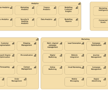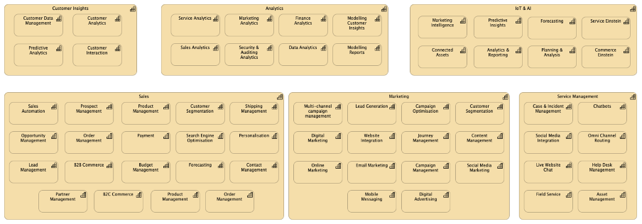 CRM (Customer Relationship Management) is a good example business capability to boost customer satisfaction, increase the customer loyalty, forecast your profitability and revenue. A CRM business capability brings many things in itself: Marketing (multi-channel campaign management, digital marketing, online marketing, digital advertising…) sales (sales automation, prospect management, opportunity management, order management…) customer insights (customer data management, customer analytics, predictive analytics…) etc. All these macro-micro capabilities have many properties mapped with various business processes.